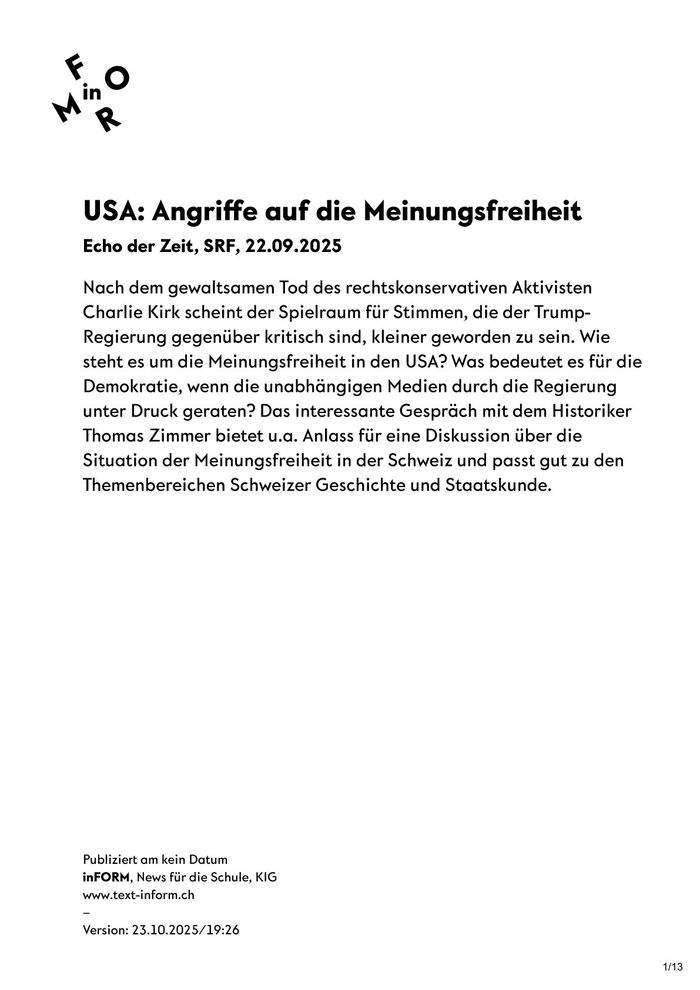 Aktuelle Themen in den Unterricht einzubauen kostet viel Zeit – mit inFORM hast du die Möglichkeit, regelmässig mit deiner Klasse spannende Themen zu bearbeiten und zu diskutieren! Das Material ist vielfältig einsetzbar als Lese- oder Hörverständnis im Fach Deutsch, als punktueller Aktualitätsbezug innerhalb anderer passender Fächer, als Basis für anregende Diskussionen und Schreibanlässe. Die Unterlagen eignen sich hervorragend für die Arbeit im Rahmen des selbstorganisierten Lernens.